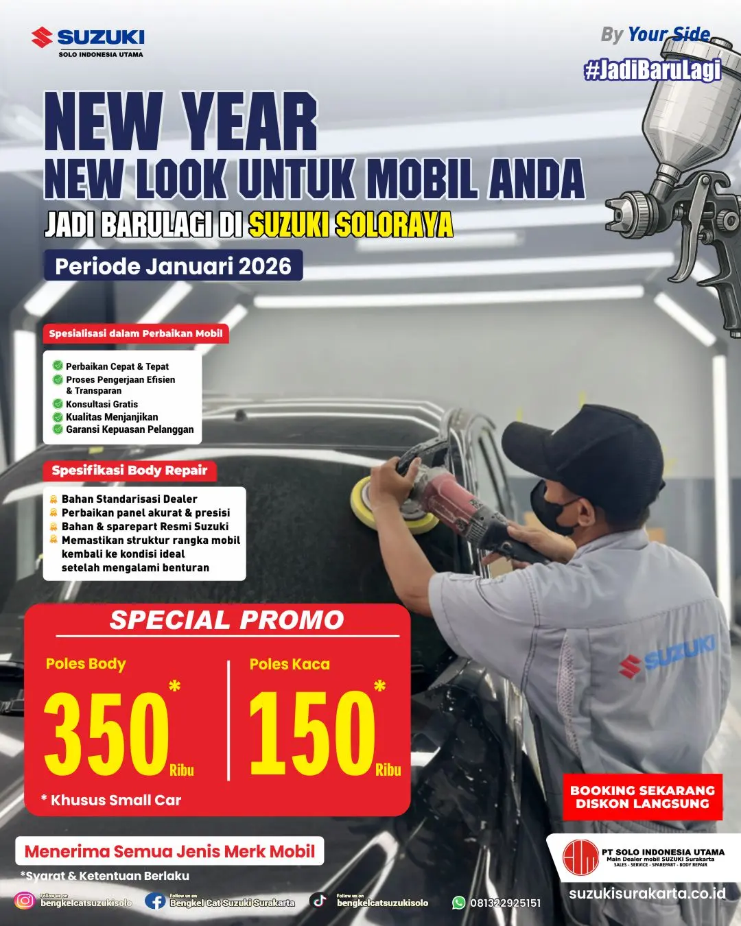Memulai tahun baru adalah momen yang tepat untuk memberikan tampilan baru pada mobil kesayangan Anda. Melalui program “New Year, New Look – Jadi Baru Lagi”, Suzuki Soloraya menghadirkan promo spesial body repair Januari 2026 untuk seluruh pelanggan.